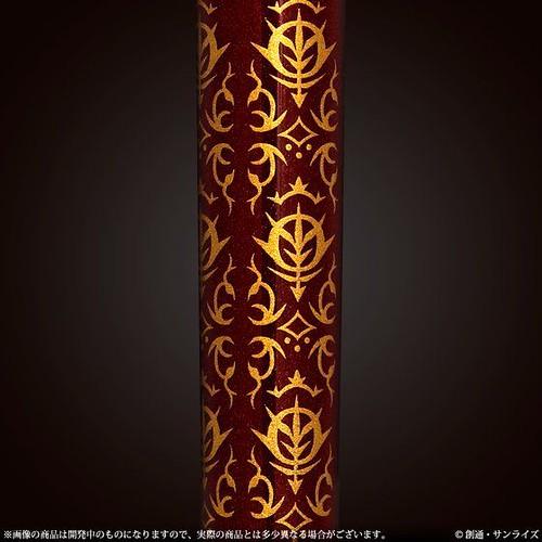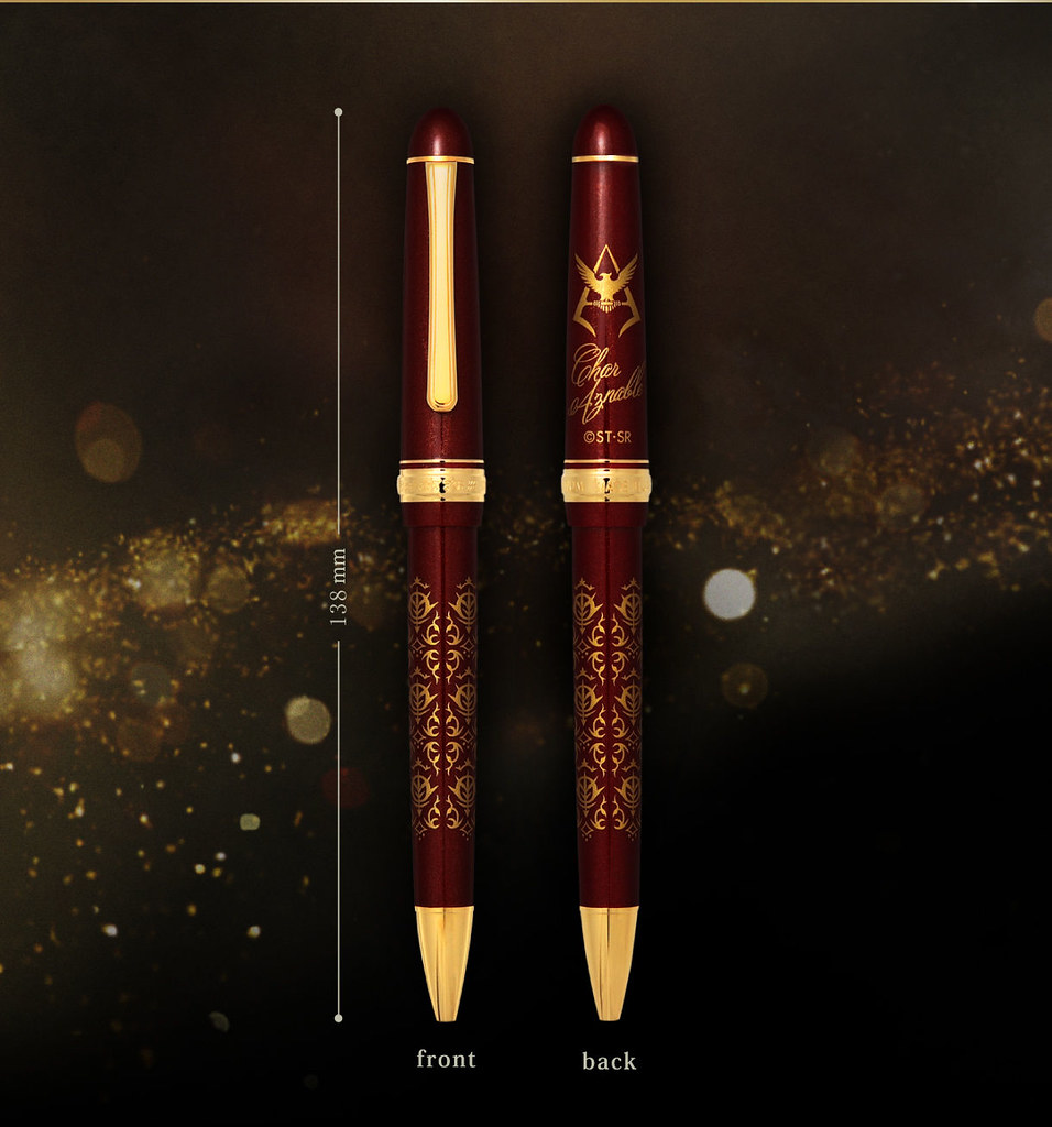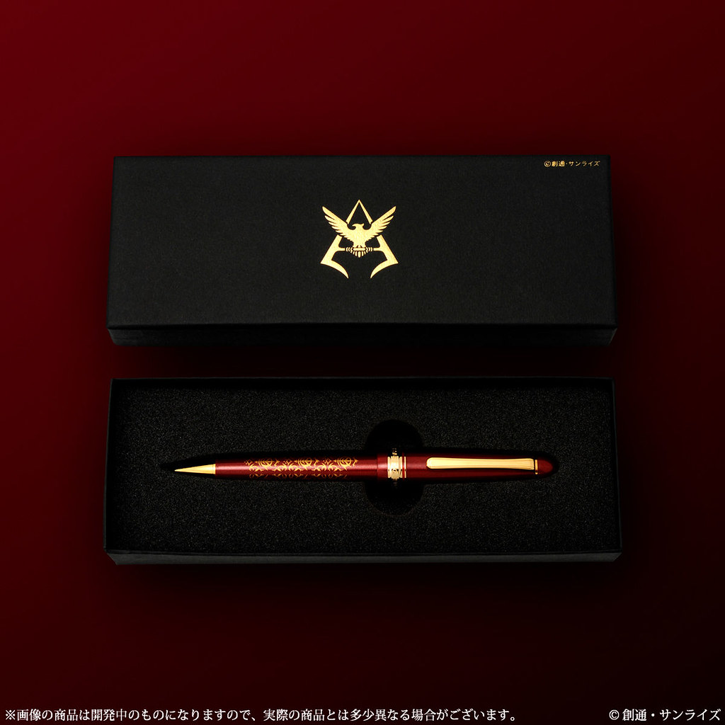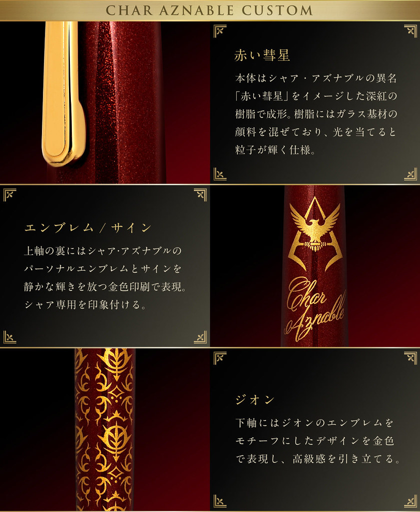 筆身由深紅色樹脂製成,設計靈感來自夏亞的經典「紅色彗星」稱號,並以樹脂與玻璃顏料混合,在光線照射下會反射亮光,帶著華麗卻低調的高質感。筆身的上軸有夏亞的個人標誌,下軸則是吉翁標誌為主題的圖樣,皆以金色印刷,增強整體奢華感。一拿出來就能展現夏亞的氣勢不凡。