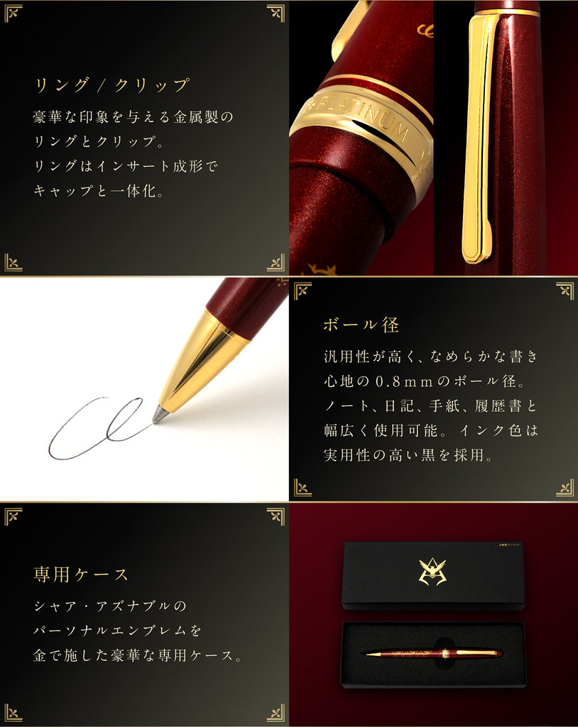 筆芯球珠為直徑0.8mm,用途廣泛且光滑好書寫,可以廣泛用於日記、筆記本、簡歷等。附帶的筆盒打開也有金色夏亞標誌,從裡到外都充滿夏亞風格,喜愛夏亞的玩具人不能錯過~