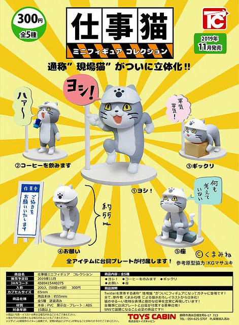 著名日本的玩具製造商 TOYS CABIN 推出過許多的轉蛋玩具,最近又發表了一款新作品,是一款將日本插畫家「くまみね」所創作的系列作品「現場工作貓」(仕事猫現場,通稱「現場貓」)所實體化的轉蛋玩具「工作貓」,預計在 2019 年 11 月發售。