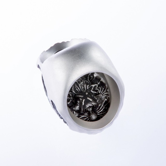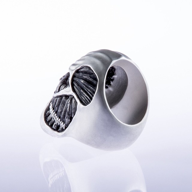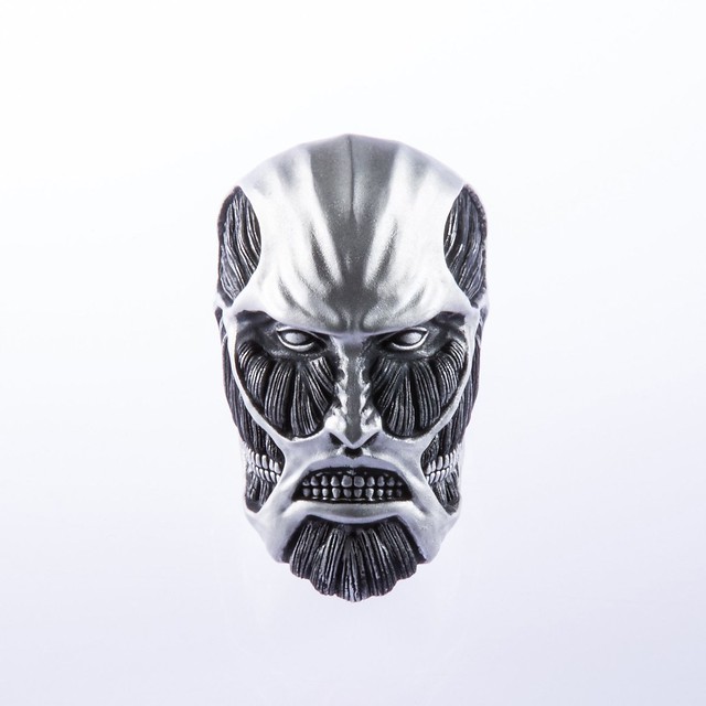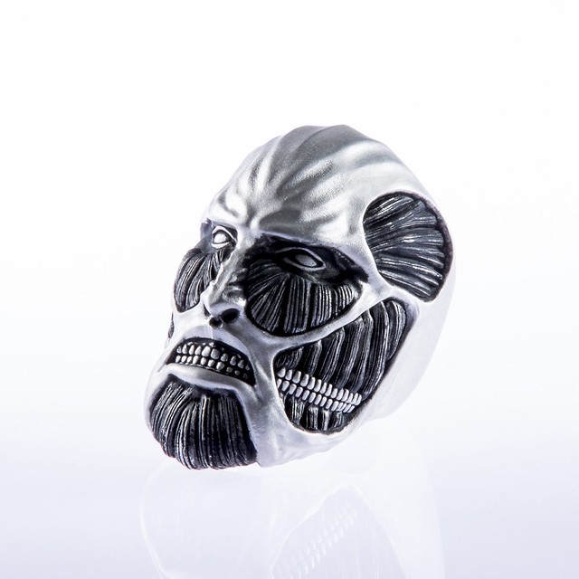 「超大型巨人戒指」採完全手工製作,將 925 銀材質雕刻出超大型巨人魄力的頭部造型,並使用煙燻塗裝技術製作陰影、深色部位,驚悚的臉龐讓人想起曾被支配的恐懼。外型不僅還原複雜的肌肉線條,戒指裏側更精密刻劃出前任繼承者「貝爾托特·胡佛」的身影,忠實再現原作的世界觀!