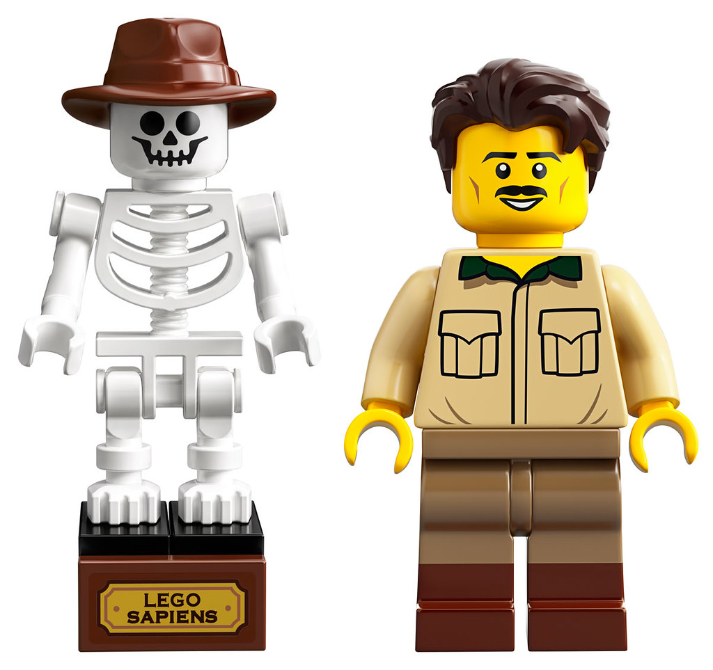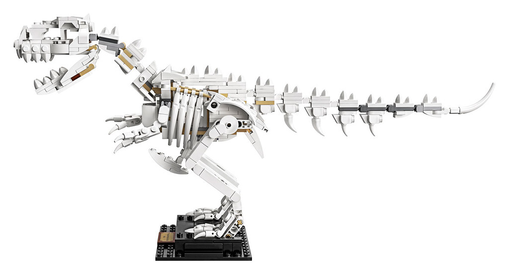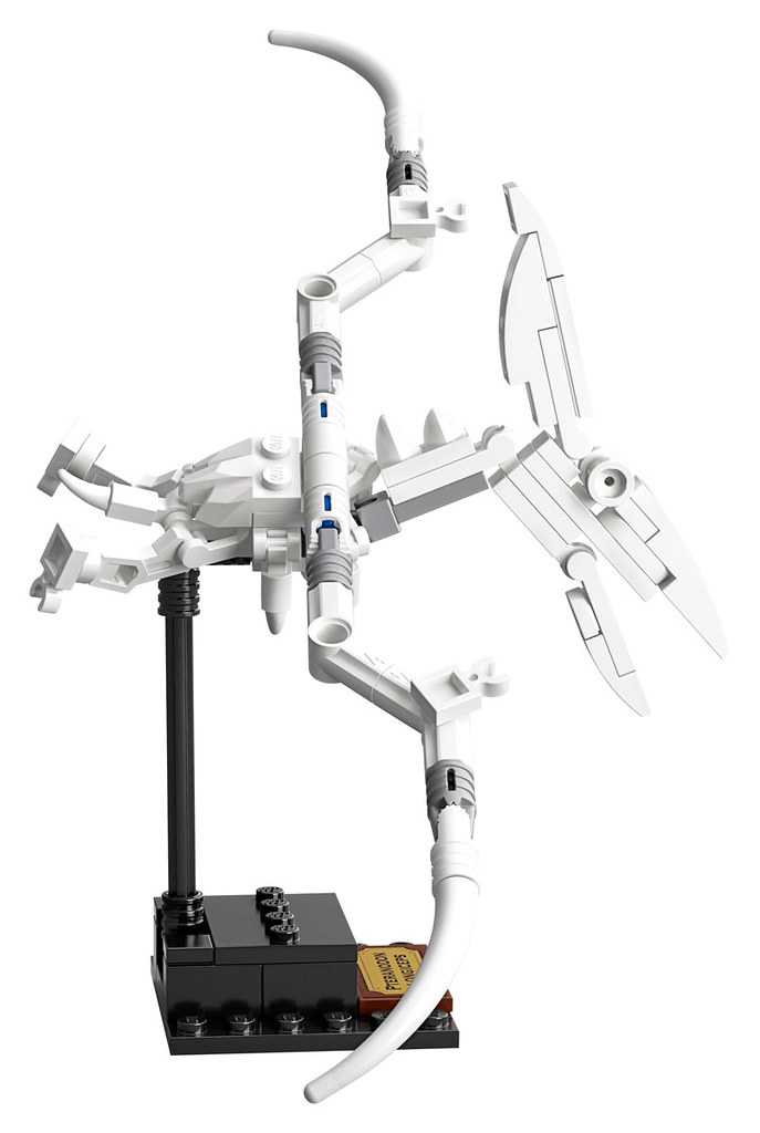 「你曾經夢想過擁有自己的恐龍博物館嗎?」是 Mukkinn 創作這款作品的出發點,他運用爪子、牙齒、弧面磚、科技系列的插銷、飛行載具的翅翼結構......等各式零件,形塑出精密的恐龍骨架模型;而在商品化之後,選出了霸王龍(T-Rex)、翼龍(Pteranodon Longiceps)、三角龍(Triceratops Horridus)三種化石並以 1/32 比例打造,恐龍骨骼的顏色變為白色,展示台也改以黑色呈現,還附上了代表智人(sapiens)骨骼展示的骷髏人偶與一個考古學家人偶。