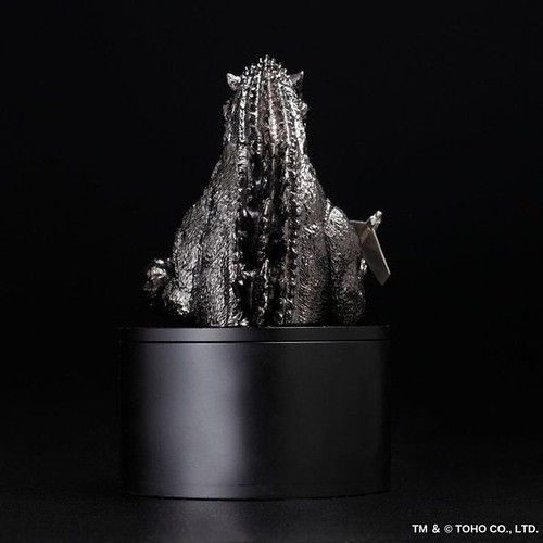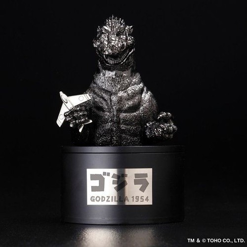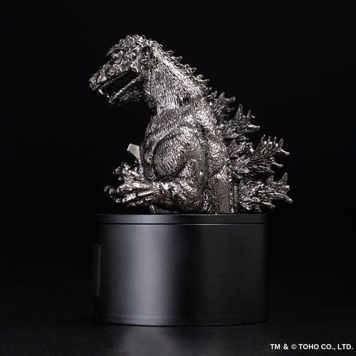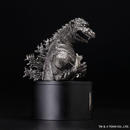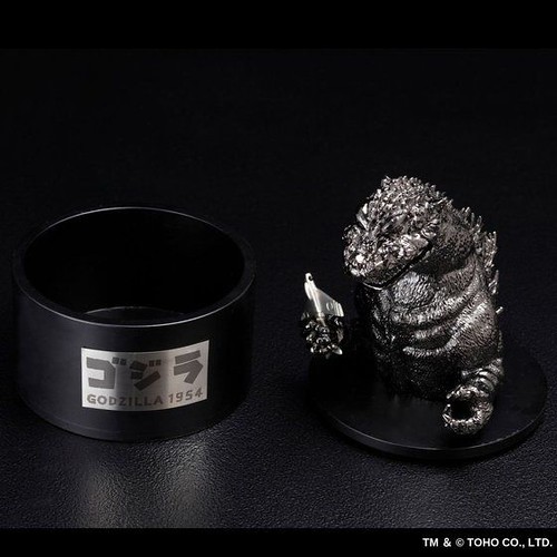 以合金製成的半身哥吉拉,細緻的表皮紋路與充滿靈魂的臉部表情都是由日本工匠一體一體手工製作,將初代(1954年)哥吉拉圓圓的大眼也完整再現,身體的細節值得哥吉拉迷細細品味手作的溫度。全高約為16公分,手上抓著銅製戰鬥機與身後突起的其中一塊背鰭可以拆卸下來做為飾品(項鍊),底下的鐵盒也可以收納一般小飾品,而就算此款哥吉拉不當展示台,單純擺放也很具分量和質感。只有限量100體實在是太殘酷啦~