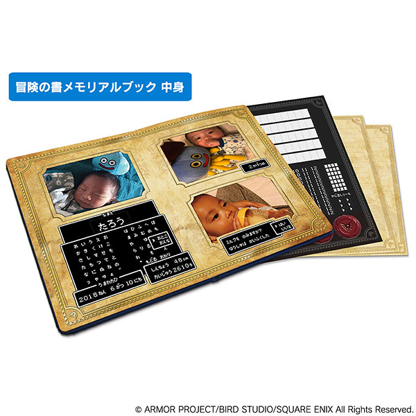 寶箱內還有「勇者之書」(冒険の書),以勇者鬥惡龍中的地圖為設計,附有勇鬥風格的小貼紙可以增加成長記錄,例如:輸入勇者孩子的名字、出生一年後的照片...等紀錄勇者的人生冒險!並在紀念冊的最末頁附上「寫給16歲的勇者」勇者便箋,讓爸媽寫信給16年後的孩子。全部都可以放到這個勇者誕生慶祝寶箱裡,除了容易保存收藏,也讓小孩將來回憶起來更充滿樂趣,可以看見自己當初是怎麼被父母玩弄成為勇者出生的紀錄,希望可以把這樣的趣味代代延續。