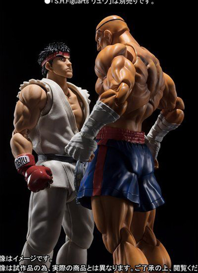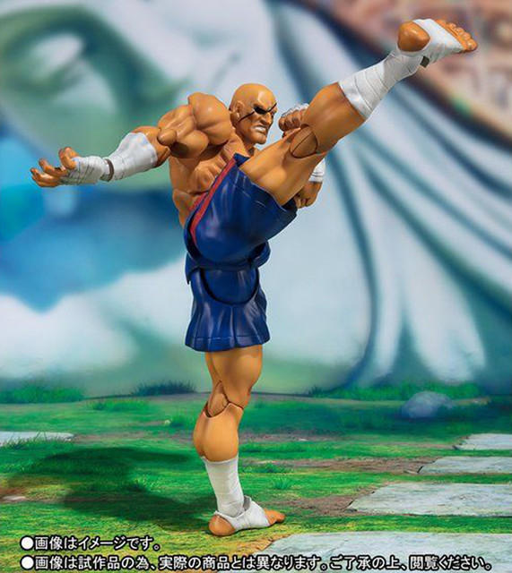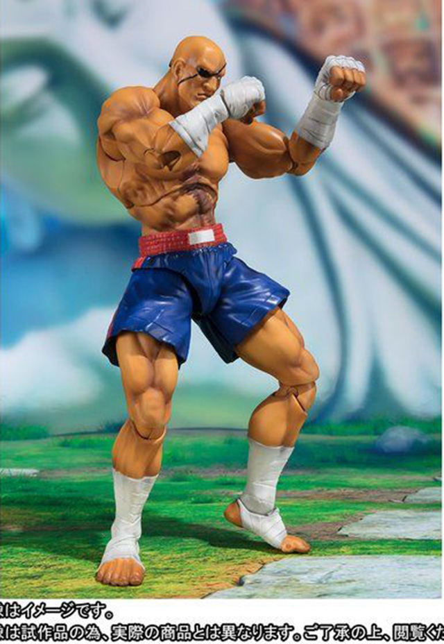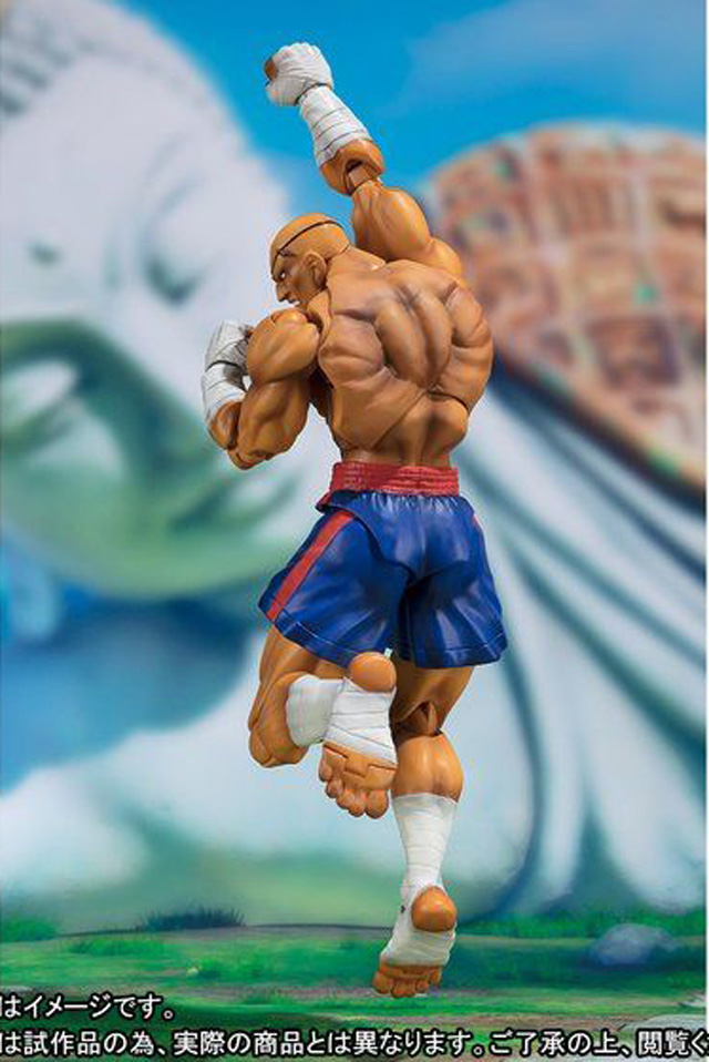 這款 S.H.Figuarts 的沙卡特,造型依舊維持他一貫的裝扮,上身赤裸,穿著藍色短褲,手腳都綁著繃帶,遊戲中常見到的動作,像是待機的預備動作、高踢腿、虎式膝擊、老虎上鉤拳等等,都可以透過 S.H.Figuarts 的完美可動性再次重現。另外也附有發射氣功的老虎波配件,以及展示用的背景彩紙,讓玩家可以重現遊戲般的場景。