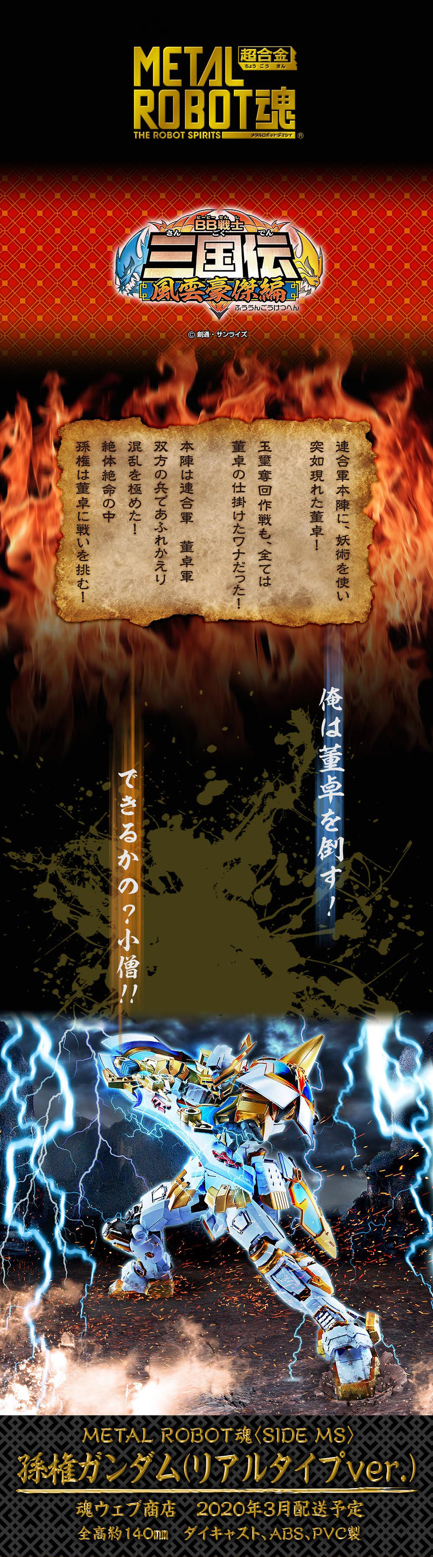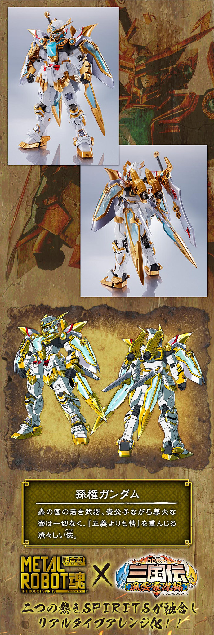 由日本 BANDAI SPIRITS 公司收藏玩具事業部 TAMASHII NATIONS 發行,結合厚重金屬質感、高度造型力、 可動結構的「METAL ROBOT魂」系列繼劉備鋼彈(REAL TYPE ver.)、曹操鋼彈(REAL TYPE ver.)後,再度發表了出自《BB戰士三國傳 風雲豪傑篇》的最新商品「孫權鋼彈(REAL TYPE ver.)」預計於 2020 年 03 月發售的消息。