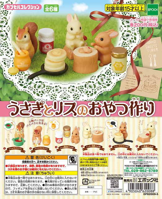 日本的著名轉蛋玩具製造商 EPOCH(エポック社),相當擅長推出以可愛動物為主題的各類轉蛋玩具,這次它們最近又推出了一款以松鼠和兔子為主題的可愛轉蛋玩具,名為「兔子與松鼠的點心製作」(うさぎとリスのおやつ作り),預計將會於 2019 年 10 月發售。