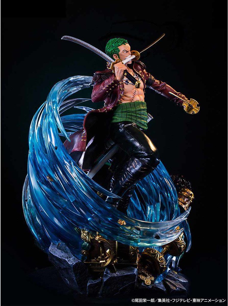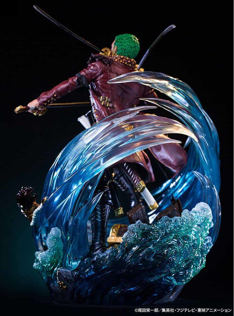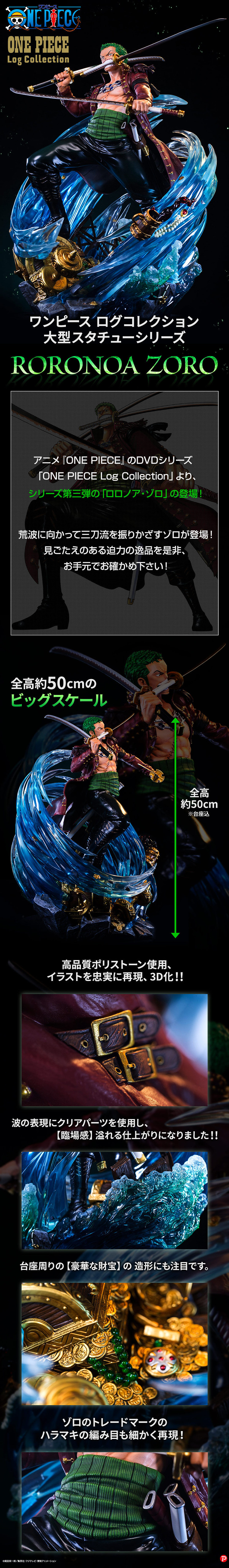 這款「羅羅亞.索隆」大型雕像系列以《航海王》動畫 DVD『ONE PIECE Log Collection“LOGUE TOWN” 』封面插畫為基礎製作,不僅擁有全高約 50cm 的魄力尺寸,更以 POLYSTONE、PVC、ABS、銅、電鍍零件等複合材質打造各部質感,雕塑出在狂瀾中施展三刀流、氣勢十足的索隆!