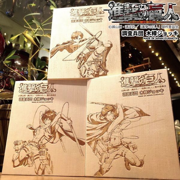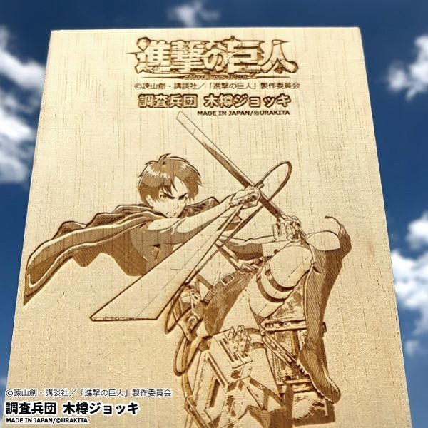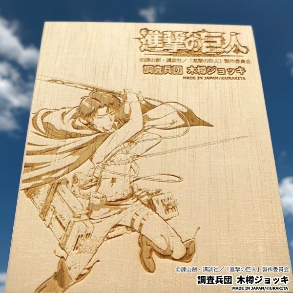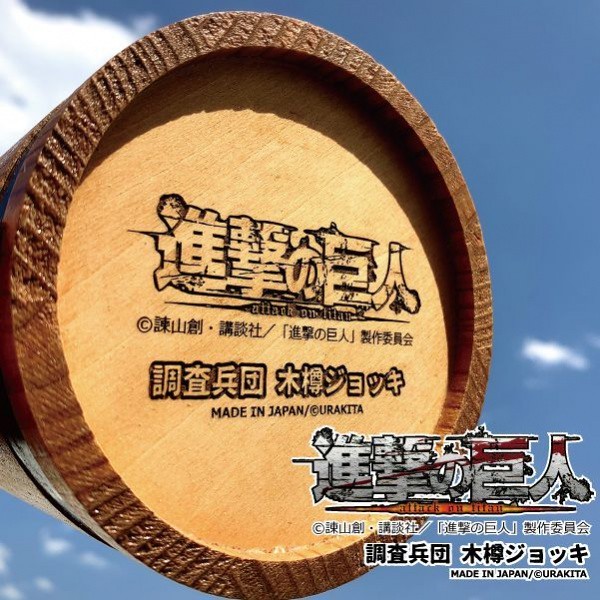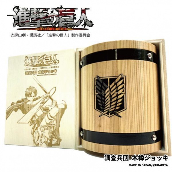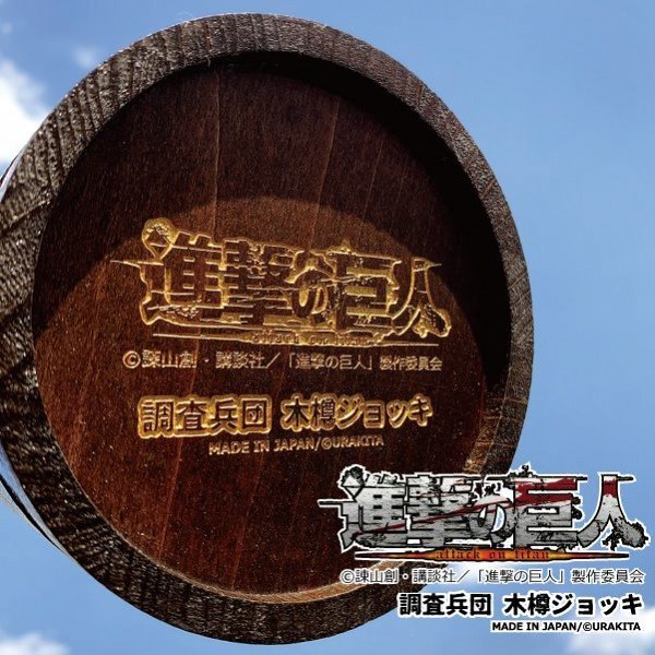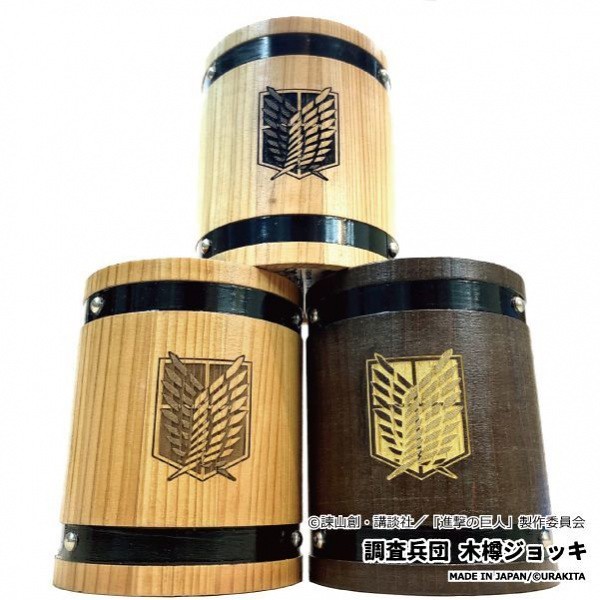 以推出航海王經典圖案木桶造型酒杯聞名的URAKITA工房,近日推出了以知名動漫《進擊的巨人》為設計的800毫升「調查兵團木桶酒杯」(進撃の巨人 調査兵団 木樽ジョッキ),分別推出三種色系:棕色、橡木、純木,並搭配主角艾連、米卡莎、里維兵長三人的特製彫刻木盒套組。參考售價為14,800日元,預計2019年11月下旬發售。