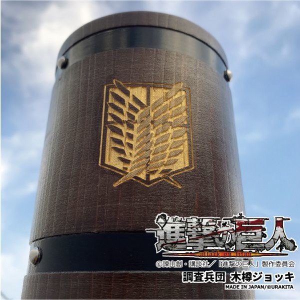 頗為符合《進擊的巨人》世界觀的800ml大木桶酒杯,在杯側雕有調查兵團專屬標誌「自由之翼」(自由の翼),杯底則是《進擊的巨人》標題徽標。包裝則是精美的木雕盒,在盒面上以精細雕刻呈現艾連·葉卡、米卡莎·阿卡曼與里維·阿卡曼的帥氣英姿,艾連盒裝為純木色酒杯,米卡莎搭配顏色較深的橡木酒杯,里維兵長為深棕色的酒杯。也可單買無木盒酒杯,每款售價為11,800日元。
