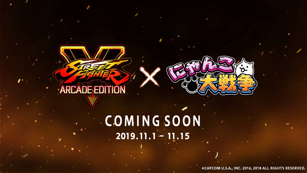 《貓咪大戰爭》(にゃんこ大戦争)是一款日本 PONOS株式會社(玩家簡稱 P社)所發行的手機遊戲,遊戲以各種充滿趣味的貓咪為主角,是一款簡易上手的橫向塔防遊戲。先前曾推出多款與動漫、電玩的合作活動,如《福音戰士》、《魔法少女小圓》、戽斗星球...等聯名,這次則是推出與《快打旋風V 大型電玩版》(ストリートファイターV x にゃんこ大戦争)的合作!預計將於 2019年 11月 1日~ 11月 15日登場。