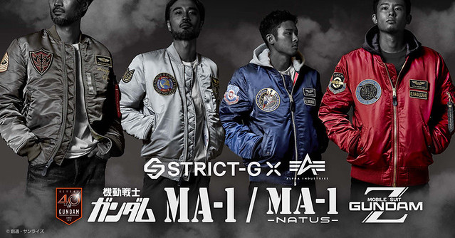 萬代推廣鋼彈事業真的是不遺餘力,玩的、用的、吃的,幾乎都能參上一腳,現在就連最流行的 MA-1 飛行夾克外套,鋼彈也要來好好參與一下。在日本將鋼彈文化與要素融合進潮流服飾的品牌「STRICT-G」,為了慶祝鋼彈作品誕生 40 周年,特別與製作軍用飛行夾克外套 MA-1 而知名的品牌「ALPHA INDUSTRIES」聯手合作,推出了四款以《機動戰士鋼彈》與《機動戰士Z鋼彈》為主題的聯名飛行夾克商品。預計 2019 年 11 月推出。