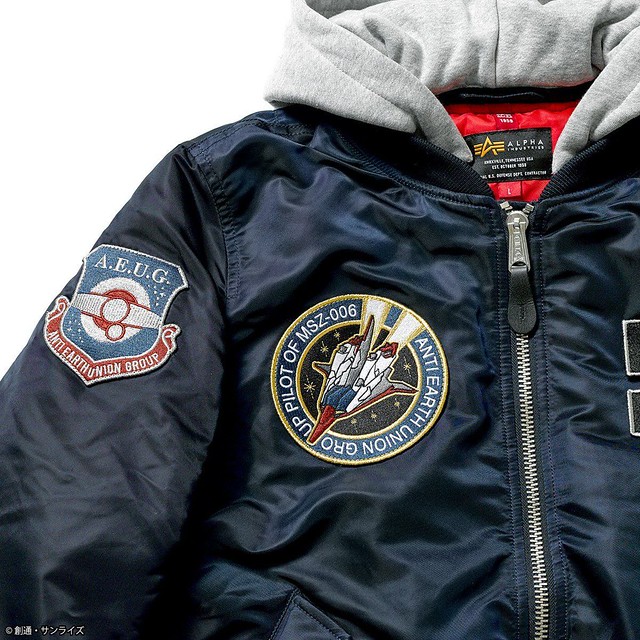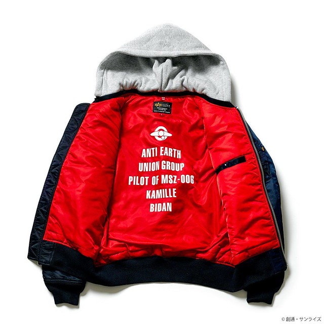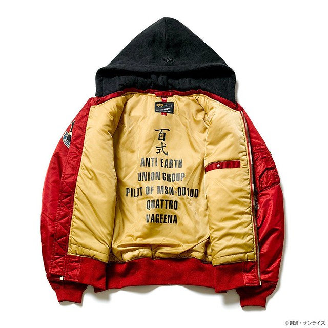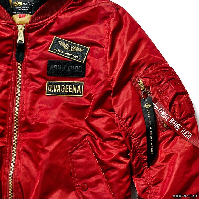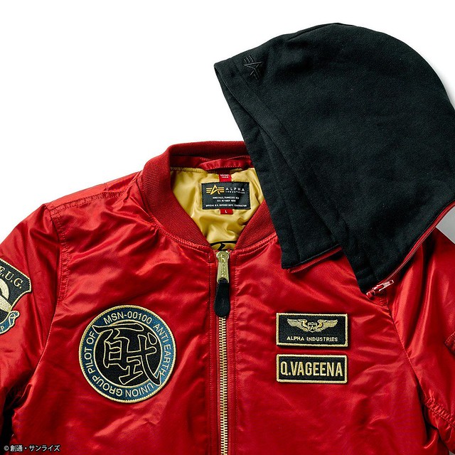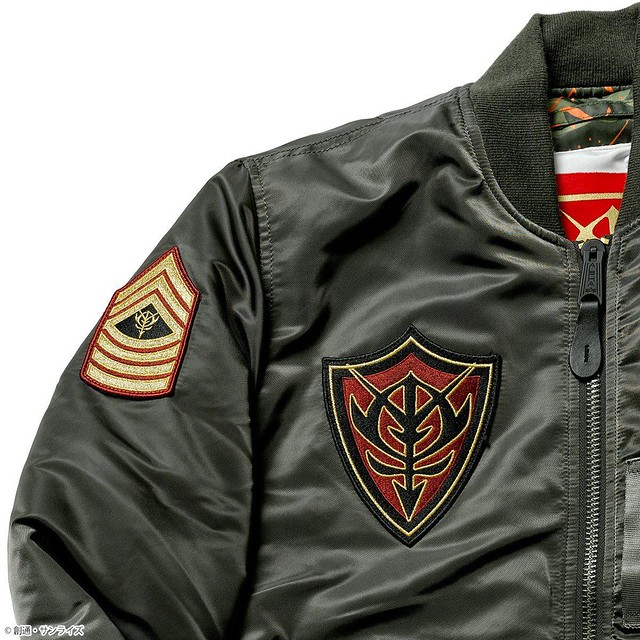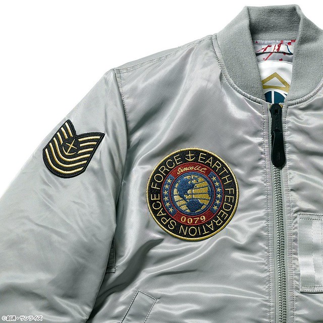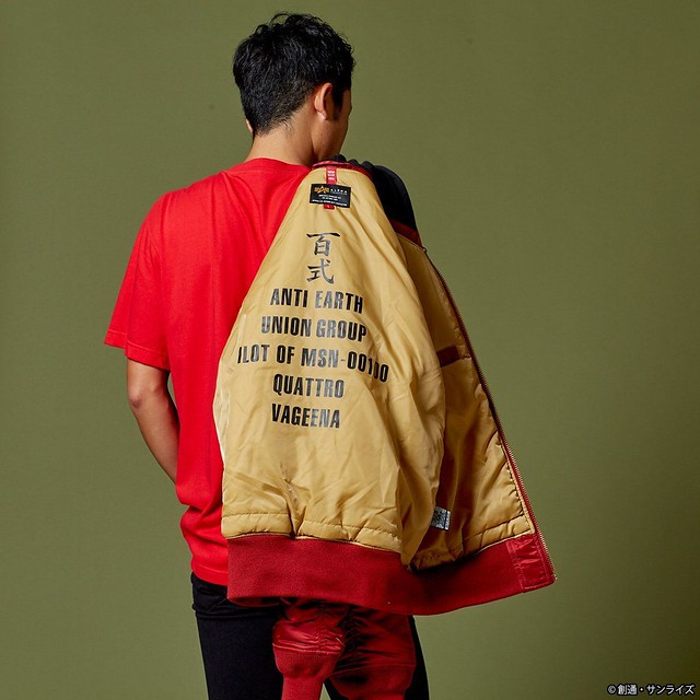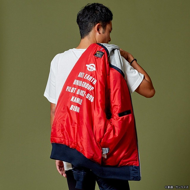 這次推出的聯名款商品,主要有 4 款,分別是以《機動戰士鋼彈》的聯邦(白色)與吉翁(綠色)兩種主題的 MA-1 外套,和以《機動戰士Z鋼彈》裡的主角卡密兒以及「庫瓦多羅‧巴吉納」(紅色彗星夏亞當時的化名)為主題造型的 MA-1 NATUS 連帽式飛行外套。每一款都外掏身上的臂章、圖案、以及內裡的文字等等,全都是滿滿的鋼彈元素,絕對是一款粉絲們必定會愛不釋手的服飾產品。