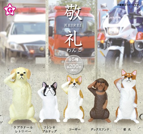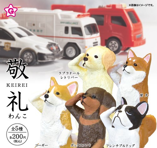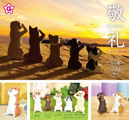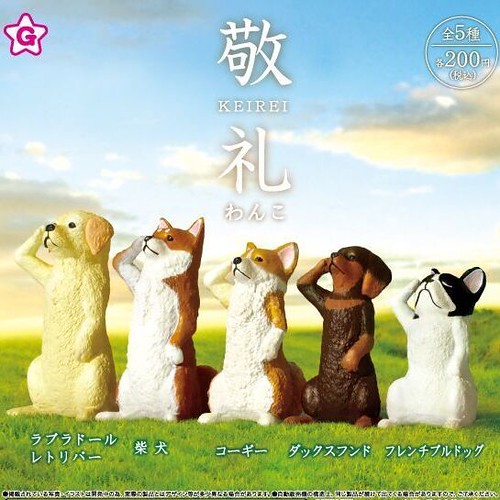 曾推出「合掌動物」、「鞠躬動物」等人氣轉蛋的日本 YELL 公司(株式会社エール)又將推出一款以「敬禮動物」為設計的「敬禮犬」(敬礼わんこ)轉蛋,一共五款行舉手禮的可愛狗狗,一轉日幣 200円,預計 2020年 2月發行。