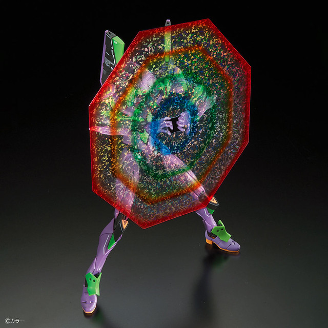 「RG 用人型決戰兵器 人造人 EVA 初號機」透過多種成形色再現設定色彩,單純組裝即可還原劇中形象。整體設計出精密的骨架結構,而各部關節更能與胸部、腹部、背部...等多處裝甲(拘束器)連動,高度可動彷彿人體肌肉般柔軟,能做出相當自然的動作,再現經典的起跑姿勢。