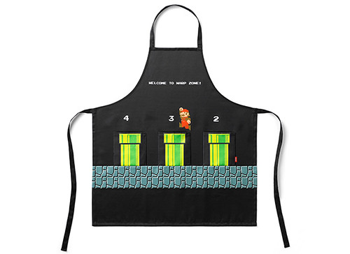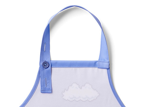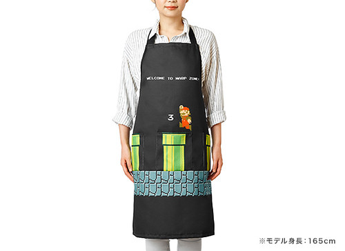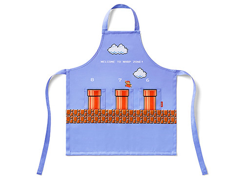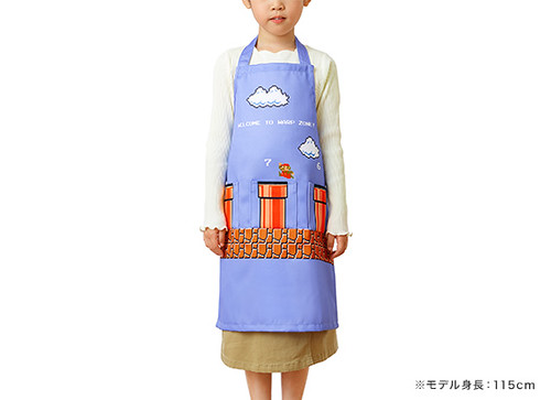 頸部有可以調整的鈕扣設計,胸前的水管是小小的口袋造型,相當可愛!小孩子著用的圍裙適用於110㎝-130㎝身高,圖樣是經典遊戲關卡中的天空配色;成人款則是適用155㎝-175㎝的身高,圖案為進入地下關卡時的黑色配色。