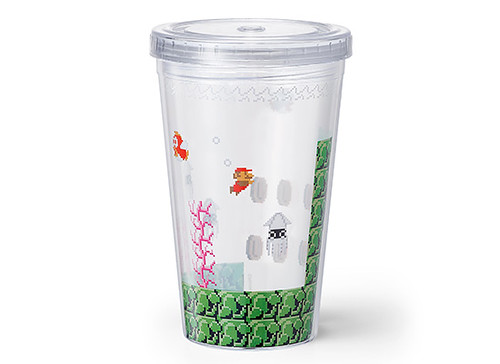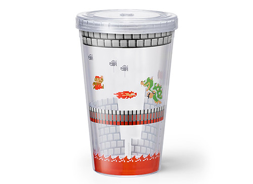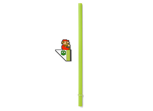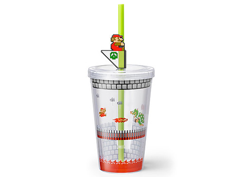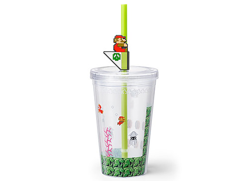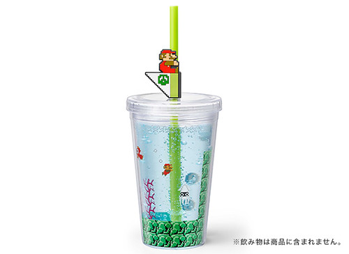 附有瑪利歐關卡過關時的旗子吸管,上面附有可以拆卸的小瑪利與旗幟,插在手搖杯造型的玻璃杯中彷彿成功過關啦!有庫巴城的圖樣與水底關卡的圖樣,兩種都非常可愛。