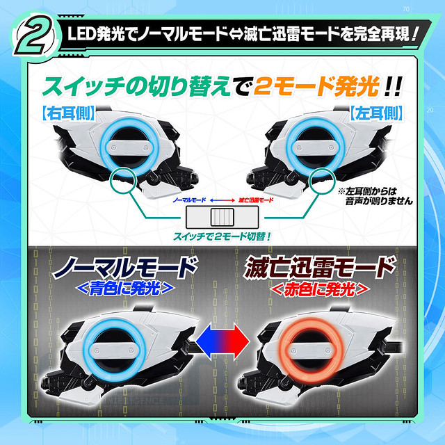 在 LED 燈發出藍光的「一般模式」下,按下按鈕即可播放主角飛電或人(高橋文哉飾)、社長秘書伊絲(鶴嶋乃愛飾)的台詞語音。切換到發出紅光的「滅亡迅雷模式」後,則能播放迅(中川大輔飾)的台詞語音,總收錄台詞共有 40 種以上!