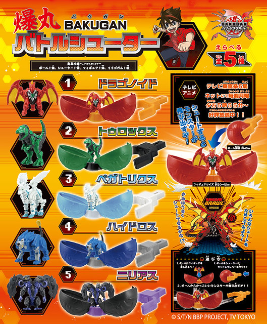 爆丸(爆丸 バトルブローラーズ)系列動畫,最早於 2007 年開始在日本當地播映,後來也推行至亞洲各地,以及北美市場。F-TOYS 此次推出的是以目前仍在播映中的第五季爆丸,名為《爆丸 決戰星球》(爆丸バトルプラネット)的動畫為主,推出裡面所登場的各個角色們所持有的爆丸。本款盒玩總共有收錄 5 款爆丸,分別為: