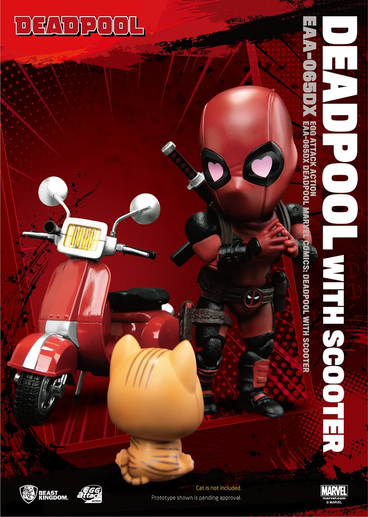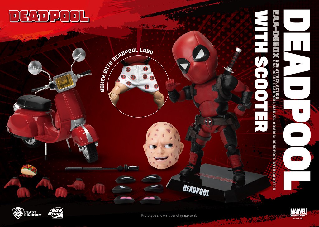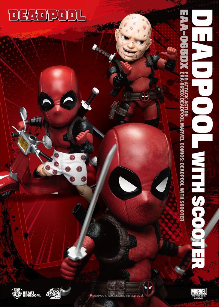 在推出「死侍」之後,由台灣玩具品牌野獸國(Beast Kingdom)發行,以獨特 Q 版造型、高度可動性為賣點的 6 吋人偶系列「Egg Attack Action(EAA)」於昨(5)日再度發表來自 Marvel Comic 的「死侍」(Deadpool)新作,這次是搭配了速克達機車與裸顏爛臉頭雕的豪華版本!預計將於 2020 年第一季發貨。