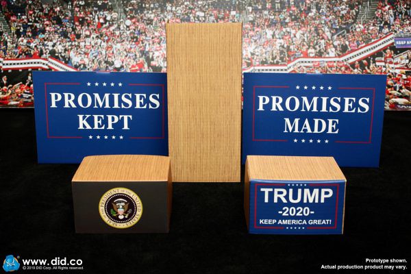 這款由 Did 所製作推出的川普立體化人形商品,可以說把川普本人的神韻都抓到了,表情維妙維肖。手部的替換配件不少,可以讓川普擺出許多姿勢,另外在頭部替換部分,其中一款的頭部之頭髮是以人造毛所製作,可以幫川普梳化成各種髮型。除了本體之外,還有許多額外的配件,像是辦公桌椅、棒球帽、以及選舉用的小講台和標語看板等等,非常豐富的一款商品。