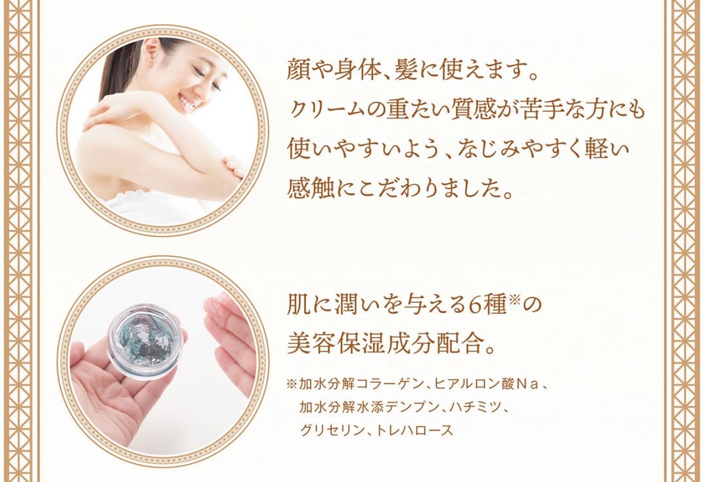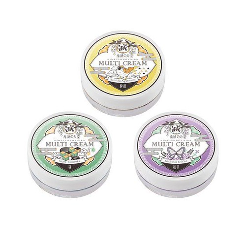 將《鬼滅之刃》中登場的熱門角色:竈門炭治郎、妹妹竈門禰豆子、嘴平伊之助與我妻善逸、冨岡義勇、胡蝶忍(胡蝶しのぶ)六個角色的個性融入在約5.5公分直徑的乳霜罐中,乳霜添加了6種美容保濕成分,是可以使用於臉、身體和頭髮上,使乾燥的皮膚保水光滑的感覺的多功能凝膠乳霜,每一款都有柔和微妙的香氣。在蓋子上有角色的象徵圖樣與色調,開蓋後則可以看見底部雙面標籤的人物插圖。不僅包裝充滿個人特色,連乳霜的味道是都依照有角色的性格作搭配。