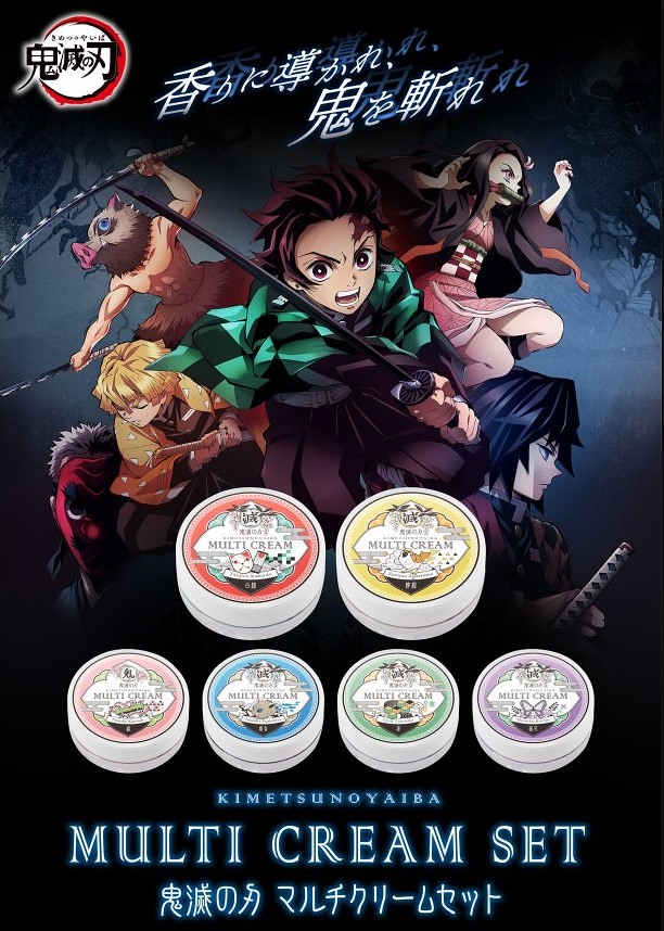 日本萬代 Bandai公司旗下的美妝品牌 Creer Beaute(クレアボーテ,常簡稱CB),推出多款熱門動漫角色配件實體化的美妝商品,這次以大人氣動漫《鬼滅之刃》為設計,推出了「鬼滅之刃 多功能乳霜組」(鬼滅の刃 マルチクリームセット),一組共含三種不同的造型與氣味的乳霜,共有六種角色商品,參考售價售價為3,630日元,預計於2020年3月發貨。