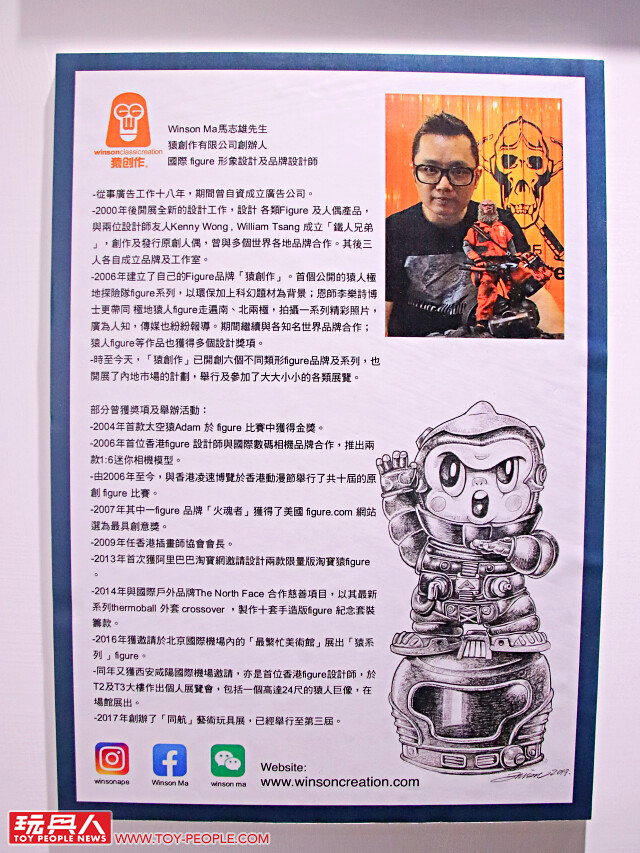 擅長以「猿」為主題,設計過相當多款可動人偶、軟膠的 Winson,其中「猿人極地探險隊」也是小編非常喜愛、印象極為深刻的系列,另外還有結合太空、武士、叢林探險題材的豐富作品,近年 Winson 也開始創作「龍虎舞獅」的系列作品,喜歡的玩具人可以到 Winson Ma 的 Facebook 與 Instagram 喔。