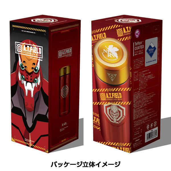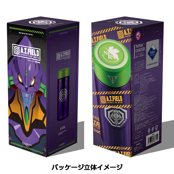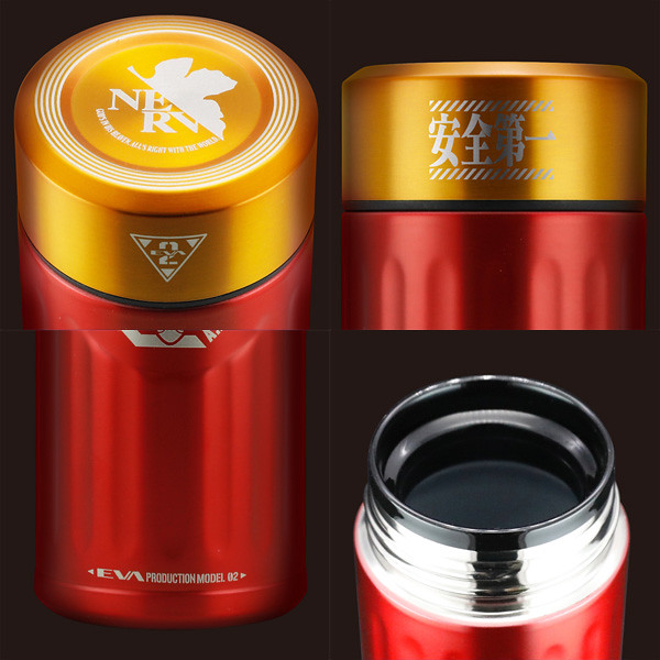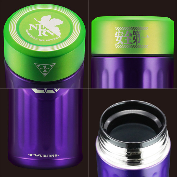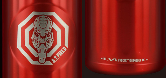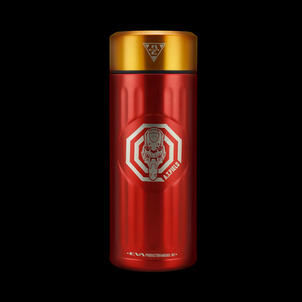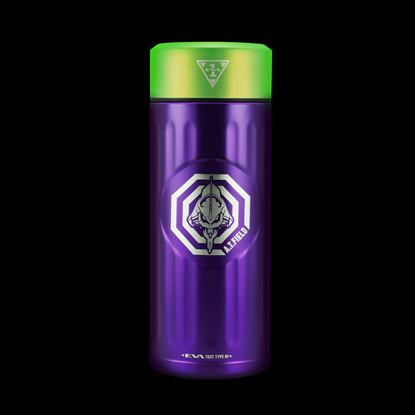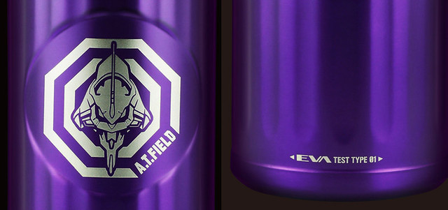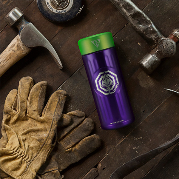 分為以「初號機」與「貳號機」為設計的款式,尺寸為直徑67mm ×高度180mm,容量為0.42L。初號機為紫綠經典配色,綠色的蓋子上有初號機標誌,瓶身正面則是A.T力場全開的初號機圖樣,在底部也有雷射雕刻的「TEST TYPE 01」字樣。「貳號機」是橘紅配色,瓶蓋上一樣有著貳號機的標誌,瓶身貳號機的圖案,而瓶底則是「Production Model 02」字樣。除了可以放心地裝咖啡、茶等飲料,也有十分良好的保溫效果,加上精美有質感的外觀設計,包裝也喜歡EVA的玩具人不要錯過啦。