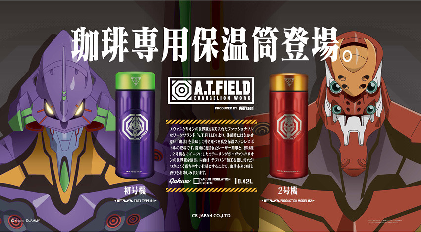 專門以EVA《新世紀福音戰士》為主題設計的時尚工用具品牌「A.T.FIELD EVANGELION WORK」(ワークブランドA.T.FIELD),將推出兩款工業用的「咖啡專用保溫瓶(エヴァンゲリオンコーヒーボトル)」分別是「初號機」與「貳號機」樣式的不銹鋼保溫瓶,簡單的配色與圖樣,低調的質感與實用性,讓A.T.力場絕對保溫你的咖啡!參考售價為3,850日元,預計於2019年12月上旬發售。