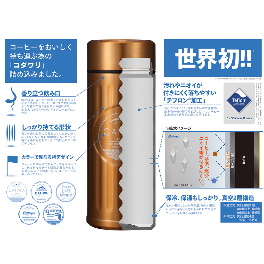 融合《新世紀福音戰士》世界視野的 A.T.FIELD EVANGELION WORK,向來以推出「堅韌而功能強大」 的工具為品牌目標,設計出保護、防寒、防水、耐衝撃等實用性商品。這次推出的保溫杯也是以此目標為設計,採用雙重真空結構,具有絕佳的保溫功能,並在瓶內的塗層使用了易潔鑊物料Teflon(鐵氟龍),不僅不會留下氣味,也非常好清潔,可以享受咖啡的原味和香氣~瓶口設計得很寬,邊喝咖啡時能夠邊聞到咖啡香氣,也方便放入冰塊,想要喝冰熱咖啡都沒有問題。瓶身以浮雕方式設計為適合握持的形狀,因此雖然口徑大卻很好握住。