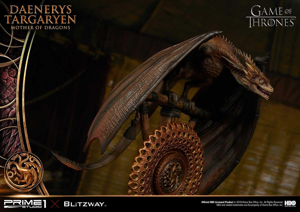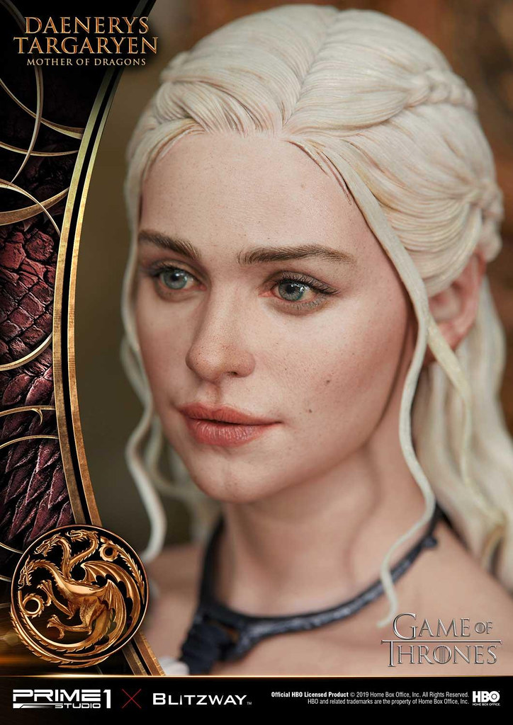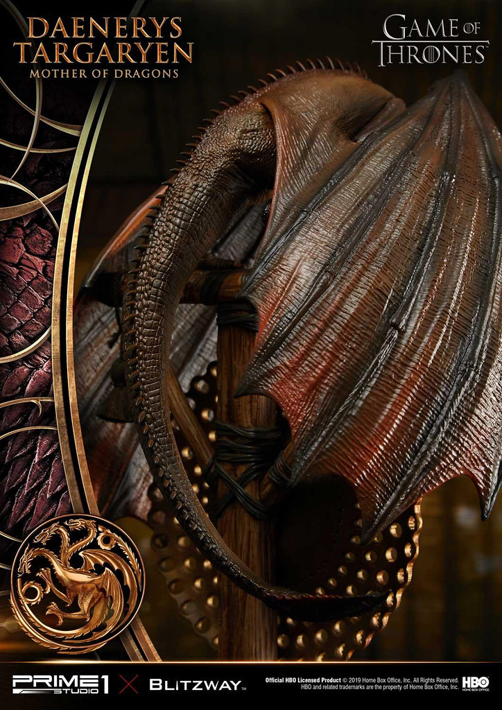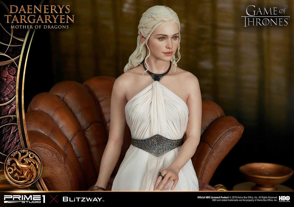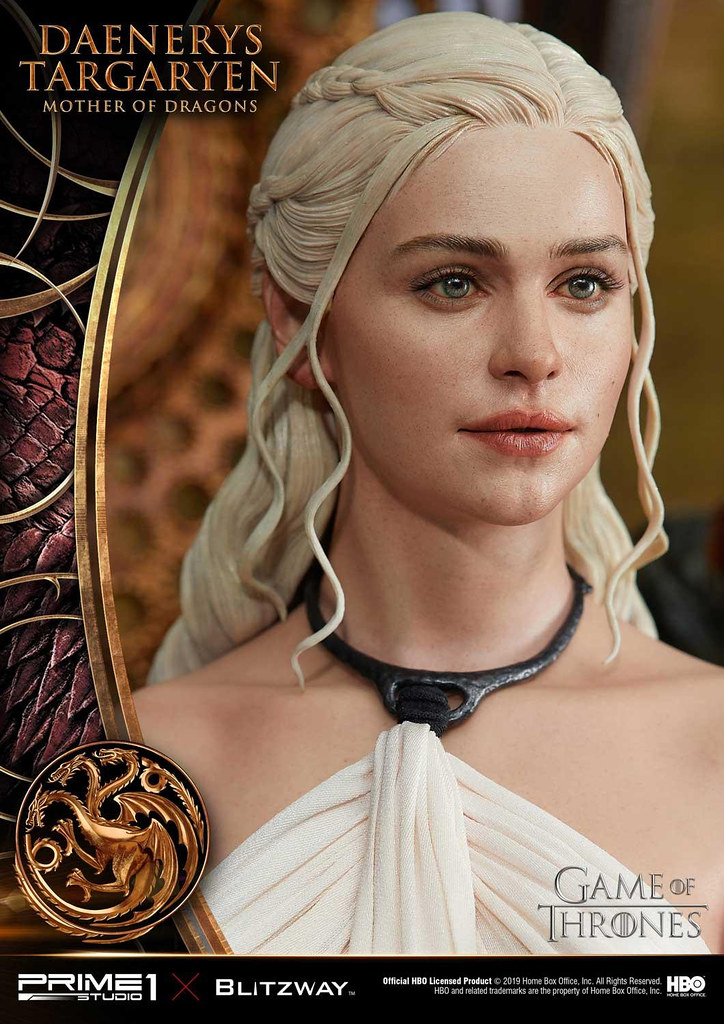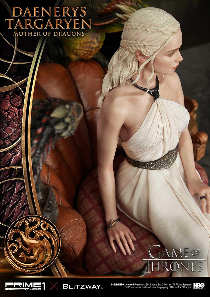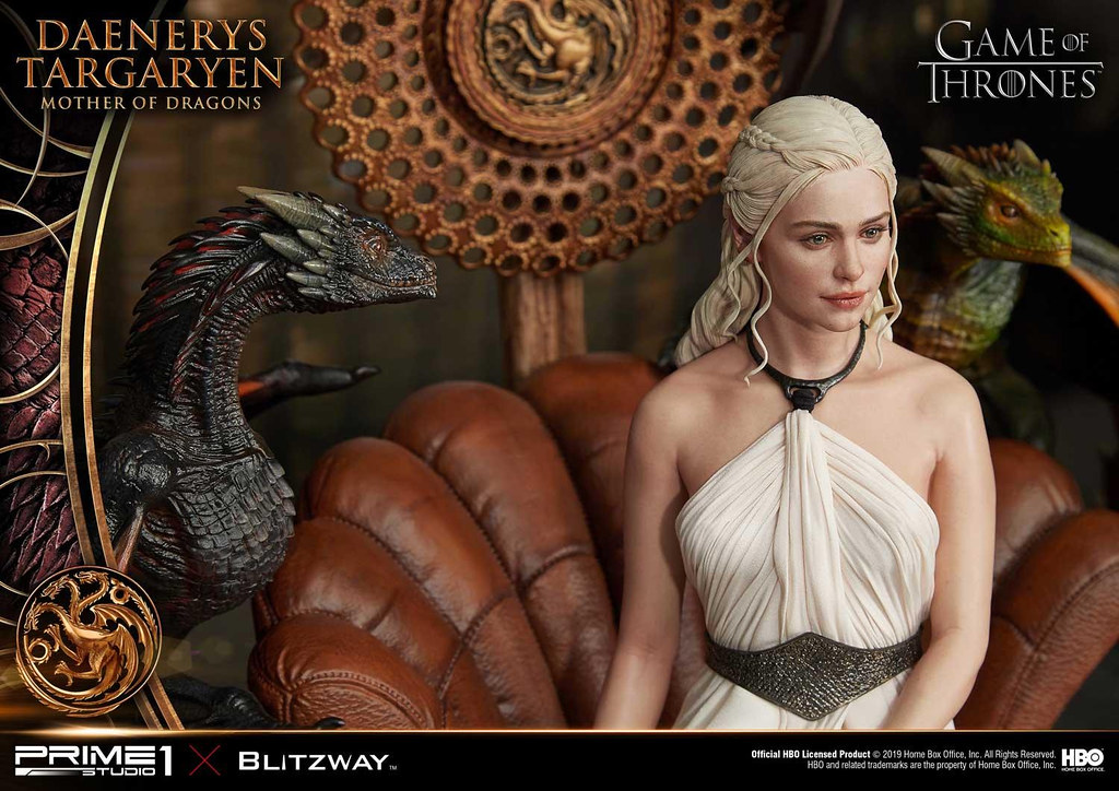 本作高約 60 公分,再現了丹妮莉絲在《冰與火之歌:權力遊戲》第三季中身穿白袍的優雅造型,頭雕細膩地形塑出演員「艾蜜莉亞·克拉克((Emilia Clarke))」的面部輪廓,從側邊欣賞更能體會到人物的神韻,紅潤肌膚、及腰銀髮的表現也十分出色,白袍則是以真實布料製作,華麗的場景中更有她的三隻龍:卓耿(Drogon)、雷戈(Rhaegal)與韋賽里昂(Viserion)陪伴左右,龍精美的漸層色、粗糙的皮膚、銳利的眼神都極具生物感,後方的裝飾中央還能看到坦格利安的家族家徽!