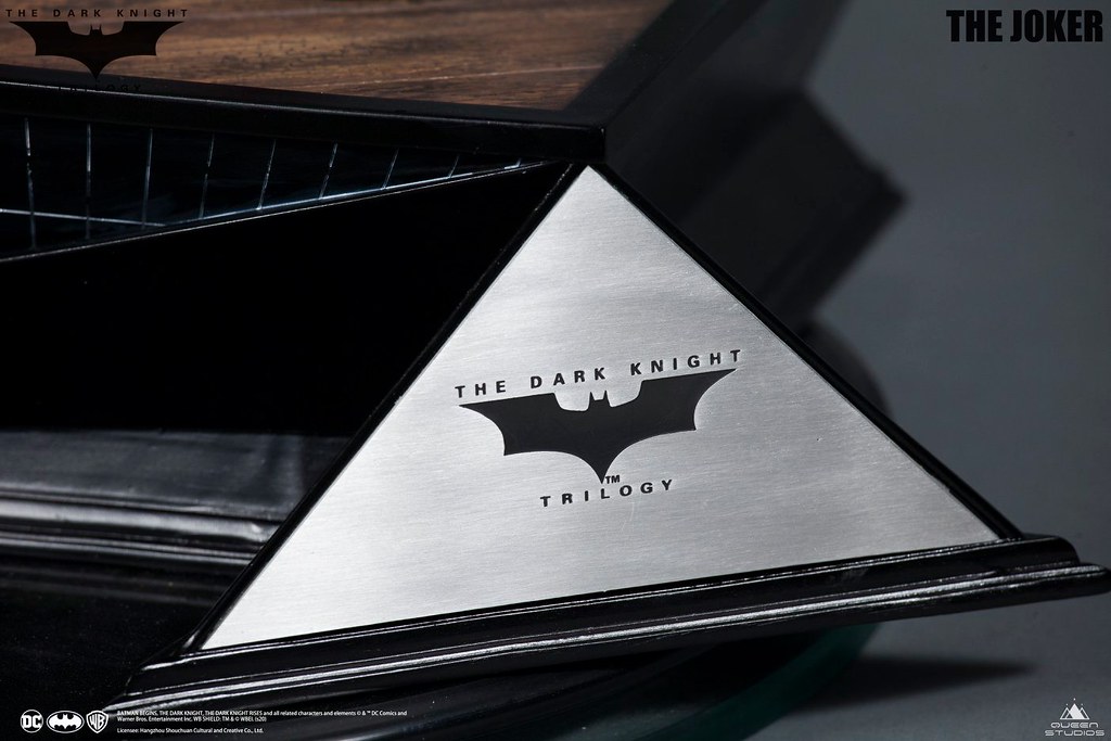 沒有了顯眼的紫色大衣,小丑的上身高度還原了嫩綠色背心搭配蜂窩狀格紋藍襯衫的造型,紫色西裝褲的皺褶、繽紛的襪子,以及皮鞋上的髒污都細緻地再現,臉上那從容不迫的笑容、直視前方的眼神,散發出胸有成竹的氣息,同時也能感受到小丑滿滿的惡意,臉部妝容、皮膚紋理和兩側的裂嘴傷痕施以高度造型力!本作共有雕髮(Sculpted Hair)與人造毛髮(Artificial Hair)兩個版本,地台還能看到黑暗騎士三部曲的 LOGO!