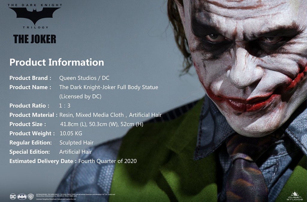 隨著瓦昆版《小丑》在全球票房創下亮眼佳績,這位 DC 漫畫中最迷人的反派之一「小丑」再度掀起話題,你是不是為了想再次回味希斯·萊傑版小丑的表現而又重看一次《黑暗騎士》了呢?成立於 2018 年的新銳雕像廠牌 Queen Studios 日前發表了來自《黑暗騎士》的 1/3 比例全身雕像新作「小丑」(The Joker)!預計將於 2020 年第四季發貨。