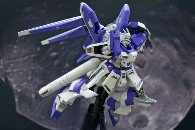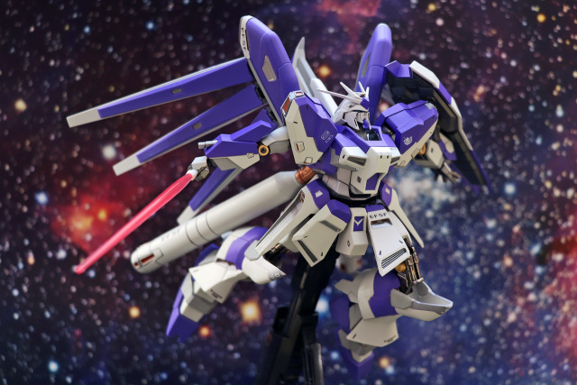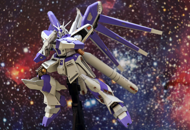 在兩部小說中的 Hi-ν 外形以上述設定為基礎卻有著完全不同的風格,《高空流光》版本為白、紫色塗裝,整體風格比較龐大厚重,後來很多遊戲中的 Hi-ν 皆是沿用此設定,1990 年萬代出品的手辦亦是以此造型為基礎(除了紫色塗裝變成藍色)。在《Gundam Battle Univerese》中,就沿用白,藍色的設計。然而 2007 年萬代將本機推出 Master Grade 模型時卻以相對纖細單薄的《貝子》版本的設定為基礎並將此設定稿宣佈為官方公式設定。這一度令一些愛好者感到不滿...... 到了 MG Ver Ka. 又變回厚重的風格。
