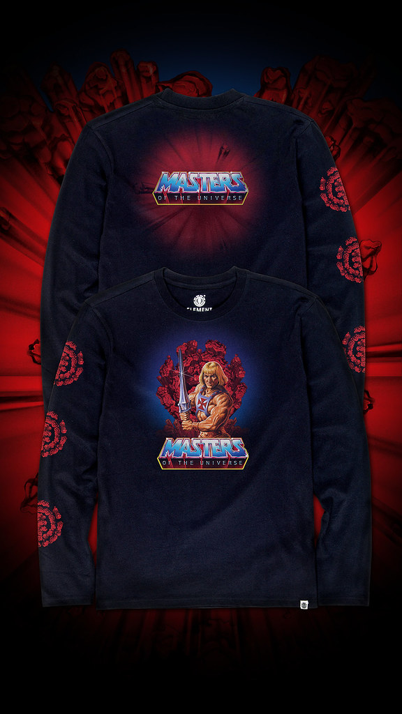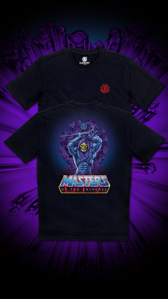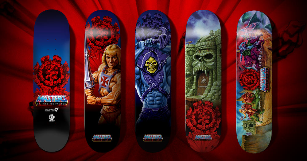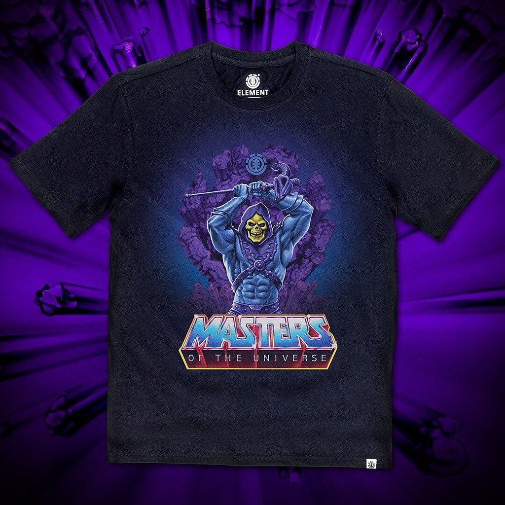 先來看看滑板吧,本次以太空超人、骷髏王、葛雷堡(Castle Greyskull)......等經典的符號為靈感,美式的設計風格十分吸引人,太空超人騎著太空戰虎/膽小虎(Cringer)大戰骷髏王那款實在帥爆!而將伊坦尼亞王國宛如火山爆發的場景注入 ELEMENT 的 LOGO 元素也相當有意思。