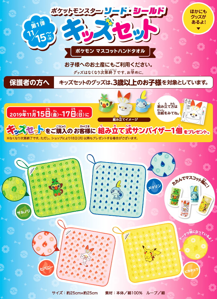 於今(15)日起選購兒童餐即可獲得寶可夢造型手帕,15~17日期間更有御三家造型紙遮陽帽!