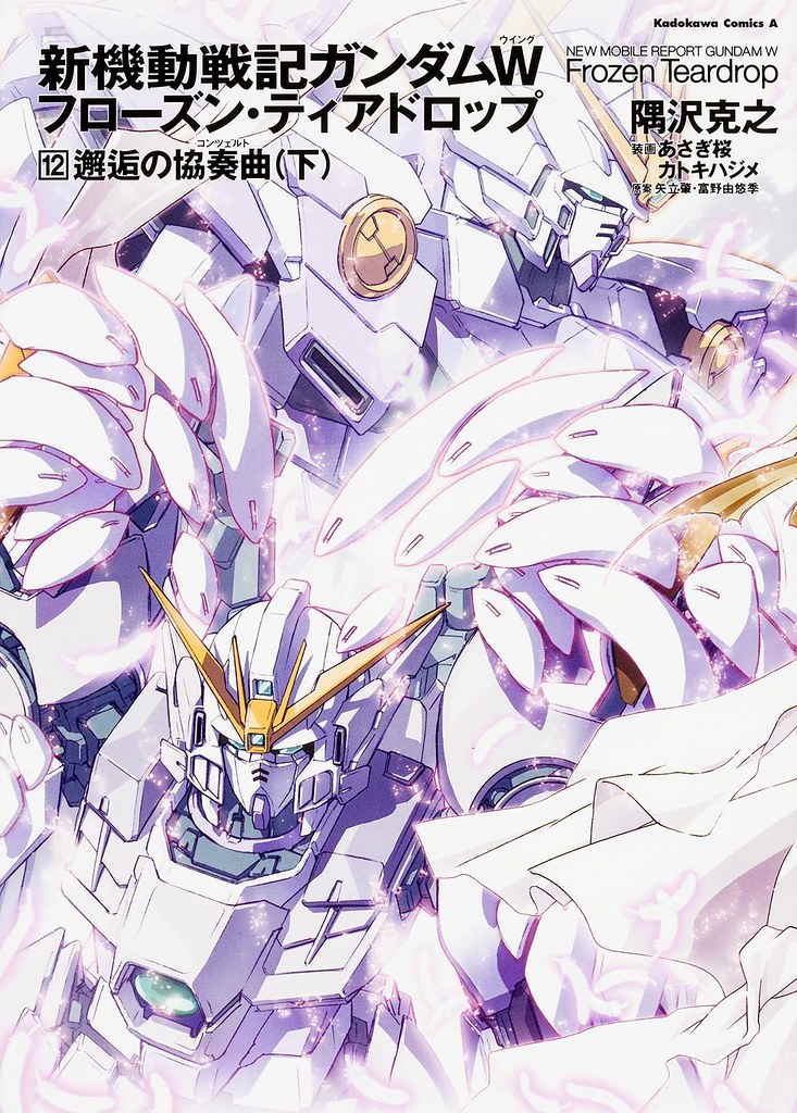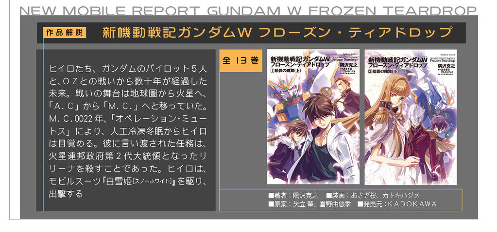 ▼《新機動戰記鋼彈W 冰結的淚滴》封面前方為「白雪公主」,後方則飛翼鋼彈零式原型機。
