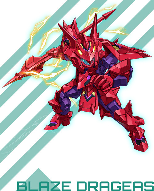 BLAZE DRAGEAS 是擁有頂尖性能的「EMPEROR GEAR」其中之一,以傳說中的生物「龍」為發想進行開發,外型彷彿包覆紅色盔甲的龍騎士,期望與真正的強者對決,厭惡卑鄙手段與弱者。其異常的高性能被視為危險的存在,設計資料在開發途中就遭廢棄,卻...。