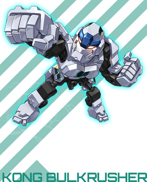 將攻擊力大幅特化的猩猩型 KONG BULKRUSHER,其巨大的手臂擁有驚人的握力,AI 優秀的演算能力則能因應戰況確實應對,私底下則認真可靠、喜愛讀書與研究文學。