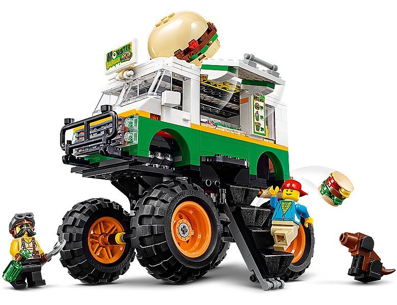 先來看看小編個人覺得最酷的「Monster Burger Truck」,車體結構與之前城市系列的「Lego 60150 Pizza Van」相似,車體側邊可以向上掀開,一旁貼著菜單,有趣的是車頂還有個大大斜斜的漢堡模型,因為超大輪胎的關係,隨車附上了梯子讓客人可以爬上去點餐,加上一旁的小餐桌相當可愛,另一個小小的亮點就是磚拼方式的小狗,非常神似呢超讚~當然,這款盒組也有 3 in 1 的遊玩方式喔。