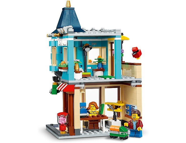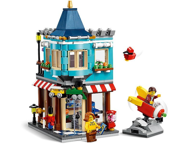 接著是能與「LEGO 31077 Modular Sweet Surprises」、「LEGO 31050 Corner Deli」......等搭配遊玩、展示的建築盒組「玩具店」,鮮豔的顏色、多變的拼裝方式,包含卡車、飛機迷你模型在內的各式小配件十分吸引人,而且更是激起了擴充的慾望呀!照著包裝盒的方式組,還能夠在店外擺放一台能給小孩玩的電動搖搖火箭!超可愛~