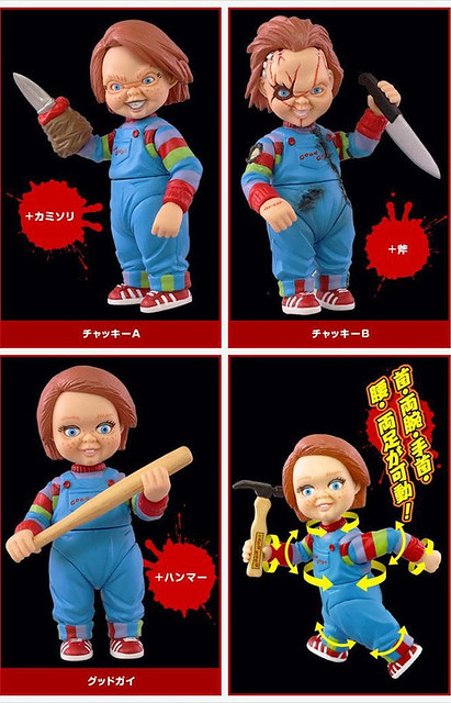 由 TAKARA TOMY ARTS 推出的這款鬼娃恰吉轉蛋,真是和它的商品名稱相當呼應,全高約有 7 公分,並且有三種款式,分別是原始的 Good-Guy dolls 模樣,以及被附身後面露凶光的模樣,和臉遭到毀容充滿傷疤的驚悚表情。手持的配件也很豐富,包括斧頭、刀子、電鋸、球棒和鐵鎚等等。另外人偶本身的可動性也不差,頭、腰、腿、雙手的肘部與腕部都可以活動,能擺的姿勢不少。
