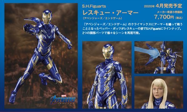 由日本BANDAI SPIRITS 公司收藏事業部發行,兼具造型、色彩的經典可動系列「S.H.Figuarts」在推出多款MARVEL漫威電影角色後,近日再度發表了《復仇者聯盟:終局之戰》的新作:「救援裝甲」(レスキュー・アーマー(アベンジャーズ/エンドゲーム)),預計將於 2020年 04月發售。