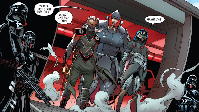 首先我們看到反派的部分,中間的角色叫做「二姊妹」(Second Sister),為審判官的一員,初次登場在達斯維德的第二系列連載。至於審判官最早是在動畫《星際大戰:反抗軍起義》(Star Wars: Rebels)帶出來的階級,為帝國為專門追殺在66密令倖存的絕地武士而訓練的原力敏感者。