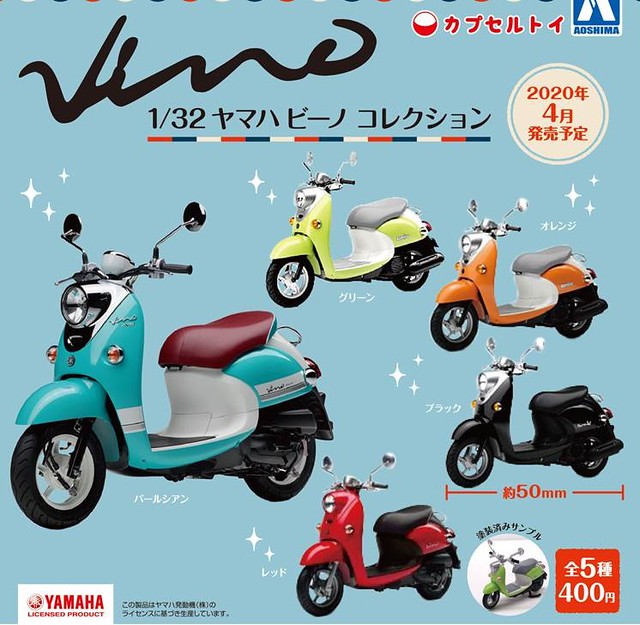 推出過許多經典摩托車與汽車縮小比例模型轉蛋玩具的日本玩具品牌AOSHIMA 青島文化教材社,最近又推出一款經典的車種轉蛋:YAMAHA VINO機車(ヤマハ ビーノ コレクション)1/32比例扭蛋,一共五款,一轉日幣 400円,預計將於 2020年 04月發售。