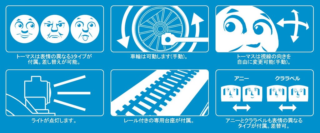 這次CoolProps推出的《湯瑪士小火車》模型,徹底分析了在《湯瑪士小火車》模型動畫劇中實際使用的模型道具,精緻將模型道具再現!以大約20cm x 89cm x 13cm的尺寸呈現,並與日本原鉄道模型博物館合作製造,推出三種可更換的面部表情:微笑臉、趣味臉與生氣臉。眼睛可以手動更改視線方向,營造出多樣化的豐富表情。安妮(Annie)和克拉貝兒(Cura-Label)也有面帶微笑和不滿意的兩款表情。