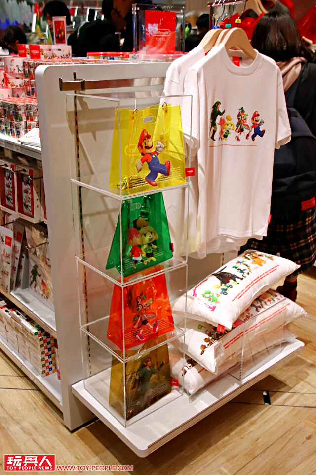 ▼ 首先必買的就是將瑪利歐、林克、女孩、西施惠與女村民結合在一起的 T-Shirt、餅乾、馬克杯,以及工作人員都有背著的透明側背果凍袋......等,每種品項都好想來一個啊!