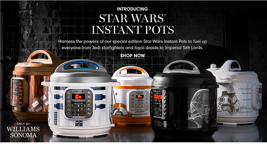 由 Williams Sonoma 推出的五款星戰萬用鍋分別為 BB-8的小容量 3 夸脫迷你鍋 、6 夸脫的R2-D2、黑武士達斯維達(Darth Vader)、帝國風暴兵(Stormtrooper)以及更大容量的8 夸脫的楚巴卡(Chewbacca)電子鍋,依照個別角色主題設計出經典配色與圖樣,並將星戰元素融入其中,連鍋種大小都和角色體型搭配,讓人一眼就能認出這些電子鍋所代表角色!