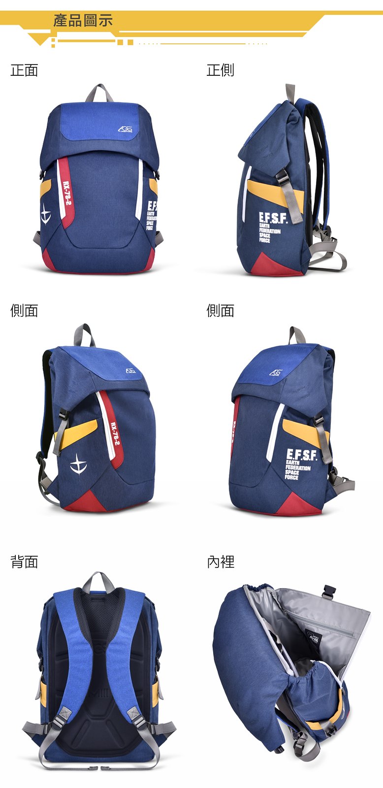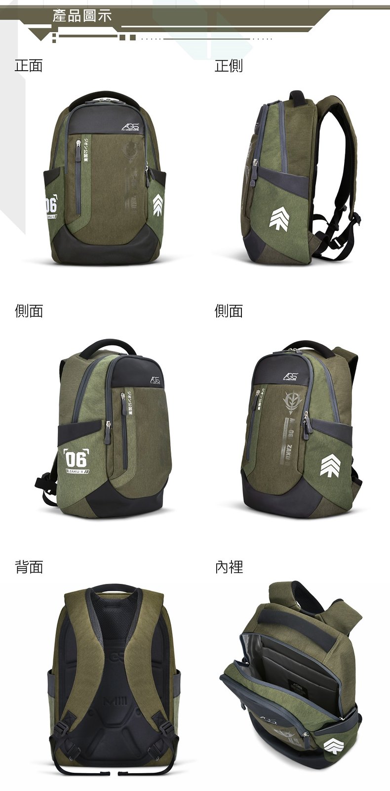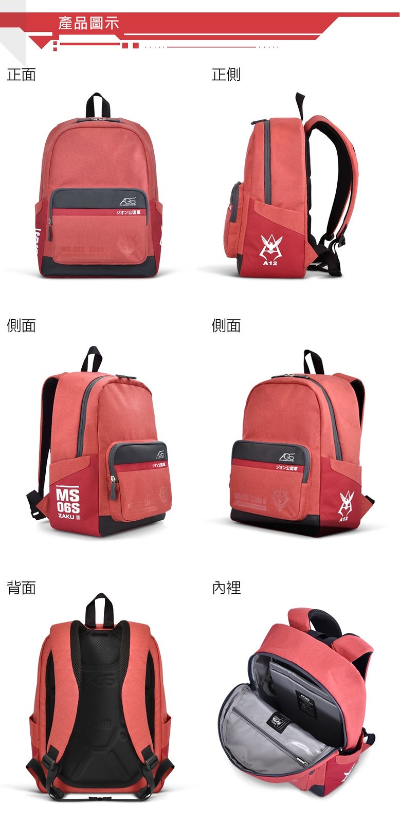 AGS 回彈減壓電腦背包融入了「RX-78-2 鋼彈」、「MS-06S 夏亞專用薩克II」、「MS-06F 薩克II」三架經典機體的要素,使用醒目的鋼彈三原色、讓你彷彿獲得三倍速的紅色彗星代表色,以及極具量產機魅力的軍綠色進行設計,並巧妙配置機身編號字樣、地球聯邦軍徽章、吉翁公國徽章,表現出原機的帥氣與魅力!