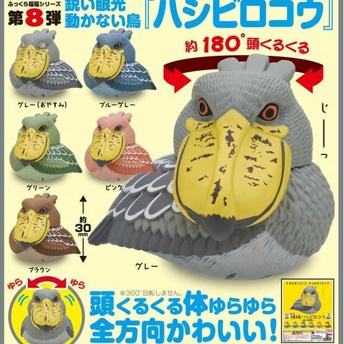 專門推出趣味轉蛋作品的奇譚俱樂部(株式会社奇譚クラブ)玩具公司,以可愛動物為主題的《豐滿福氣》(暫譯,ふっくら福福)系列,先前已出過多款鳥類「豐滿福氣麻雀(すずめ)」、還有「豐滿福氣雞(にわとり)」、「豐滿福氣鸚鵡(インコ)」以及「豐滿福氣鴿子(インコ)」、「豐滿福氣企鵝(ペンギン)」等轉蛋作品,這次又推出第8彈續作:「豐滿福氣鯨頭鸛」(ふっくら福福ハシビロコウ),一共六款,每轉300日幣,預計將於 2020年 03月發售。